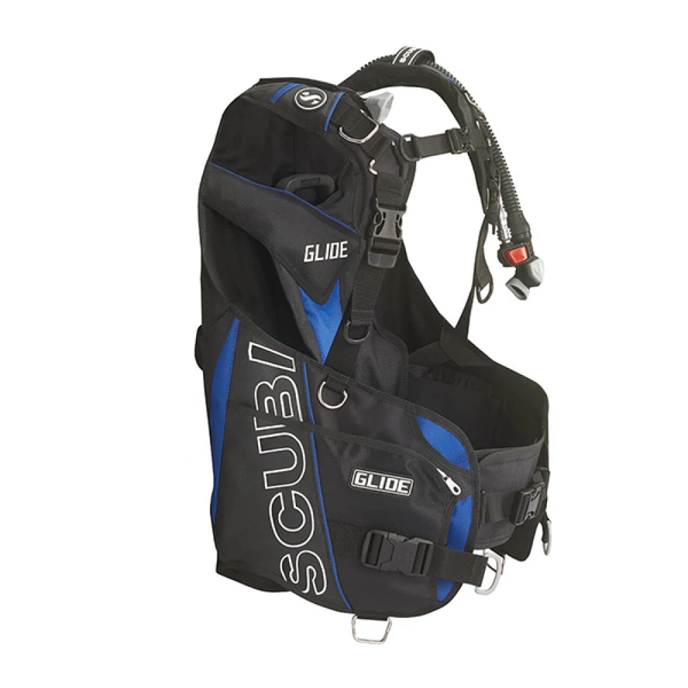 The Glide is a front-adjustable BCD with special design features to maximize comfort, fit and performance. The Glide comes with a new Y-Fit shoulder design that adapts to the body better, allowing for excellent control and range of motion for arms. The stainless steel triangular ring manages the forces in the Y’s center, balancing pressure over the body and keeping the harness under control, regardless of dive conditions or your position in the water. The lower strap is connected to the backpack where it meets the cummerbund, creating a safe and comfortable link. The dump system includes three new-generation valves that allow you to deflate the wraparound bladder in any swimming position.