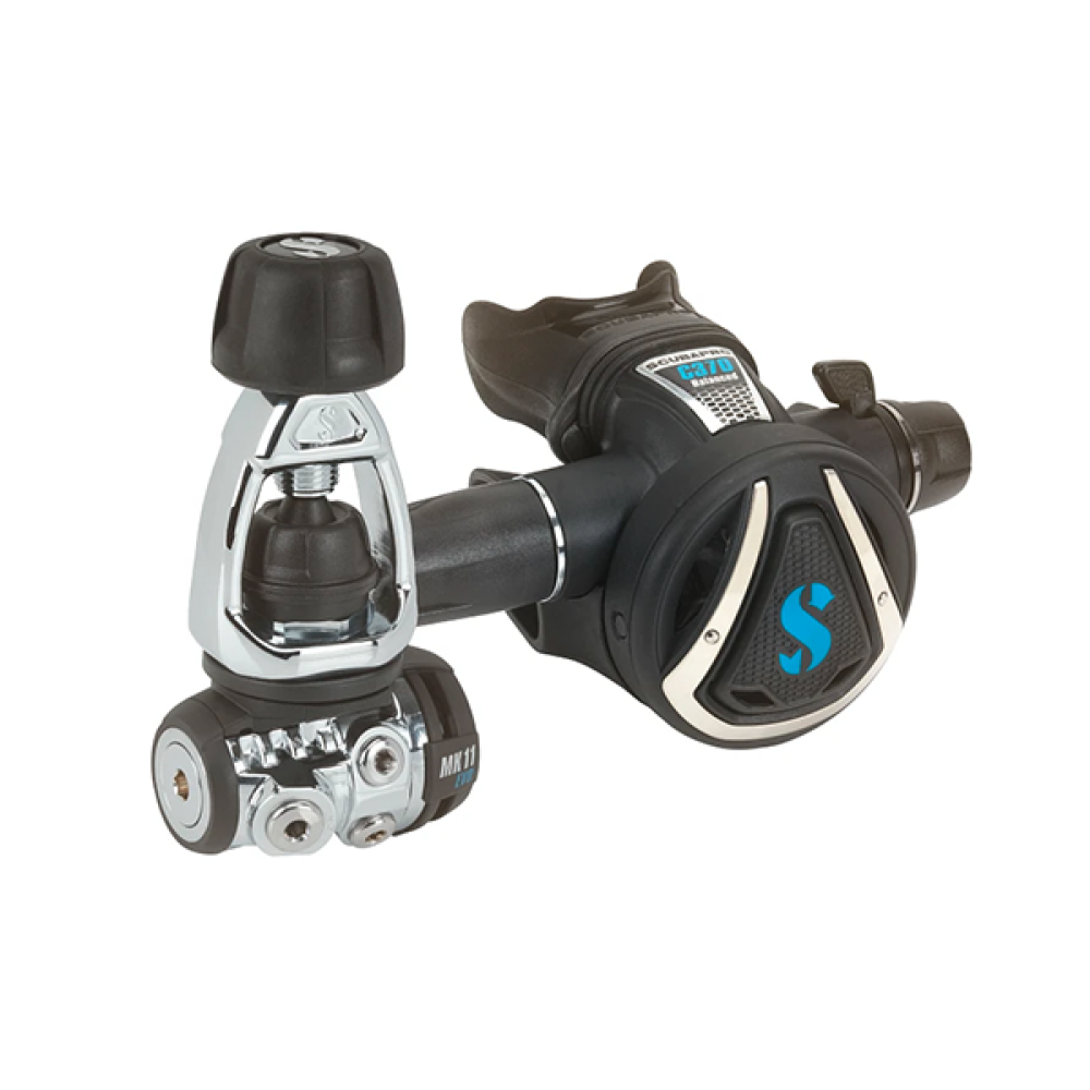 The MK11 EVO/C370 is a compact, dependable air delivery system that makes diving fun, wherever your travels take you. The new balanced diaphragm MK11 EVO features an innovative double spring layout, forged brass body with thermal fins and protective plastic bumpers to ward off scratches. The compact C370 offers convenient user controls including a diver-adjustable inhalation effort knob, a coaxial dive/pre-dive lever and a large, easy-to-activate purge button.