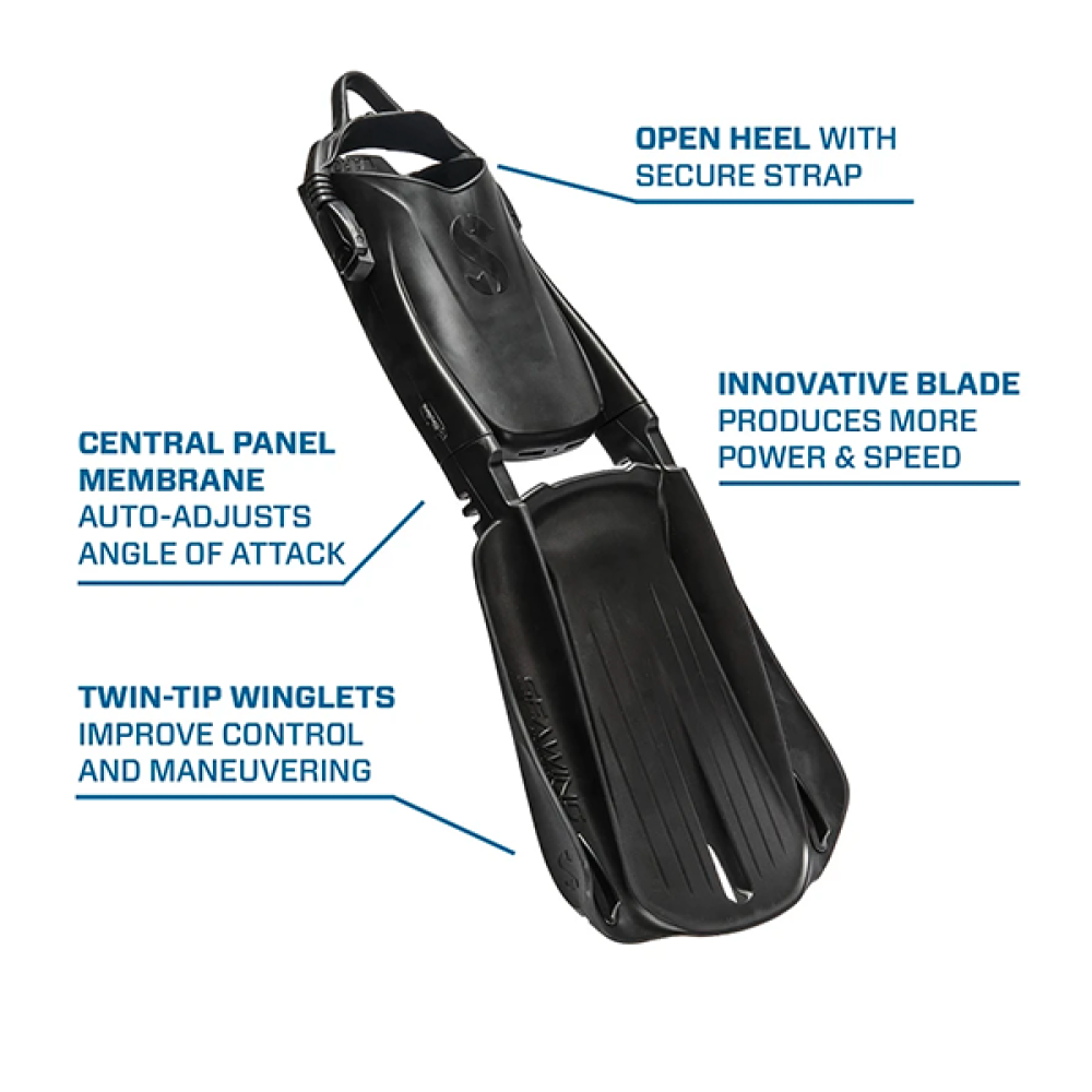 SCUBAPRO’s Seawing Supernova represents the next generation of powerful SCUBAPRO fins. Winner of the prestigious, internationally-recognized Red Dot Award for product design, the new Seawing Supernova is a step up from the Seawing Nova in performance, construction, fit and versatility. The flexible Auto-Adjust central panel fine-tunes the angle of attack according to the strength of kick by counter-pivoting, providing a milder angle of attack for comfort when kicking gently, a more aggressive angle of attack when kicking at full strength, and anything in between. When it comes to frog and alternate kicks, the new twin-tip winglets increase control and markedly improve maneuverability. The Seawing Supernova’s innovative two-piece design, with blade and foot pocket molded separately, makes transport easy, and with the optional full foot pocket the fin can be modified to handle any warm-water dive scenario. The Supernova is the go-to fin for avid recreational and professional divers seeking maximum speed, power and kicking control in all diving conditions.